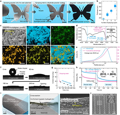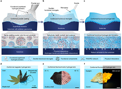 圖1.凝膠干粉噴涂策略用于部署適形多功能水凝膠皮膚。