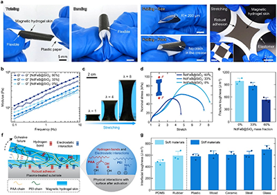 部署的磁性水凝膠皮膚堅固耐用,能夠承受扭曲、彎曲、折疊和拉伸而不出現破損,分層或界面滑移。通過180度撕裂測試測量了磁性水凝膠皮膚的斷裂韌性,33w%NdFeB@SiO2顆粒負載下斷裂韌性超過800 J/m2,60wt%負載下超過500 J/m2。此外,通過90度剝離測試測量了磁性水凝膠皮膚的在各種柔軟和剛性材料上的界面韌性。測試過程中所有樣品均表現出內聚破壞和高界面韌性:PDMS>480 J/m2,橡膠>590 J/m2,塑料>570 J/m2,木材、陶瓷、鋼鐵>600 J/m2,玻璃>690 J/m2。