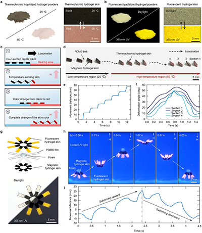 此外,作者還開發了熱致變色和熒光水凝膠皮膚。這些功能分別通過商業熱致變色顆粒和AgInGaS/ZnS量子點實現。通過組合設計,作者將這兩種仿生功能整合到磁性軟機器人中,使其能夠模擬自適應的著色和熒光行為。