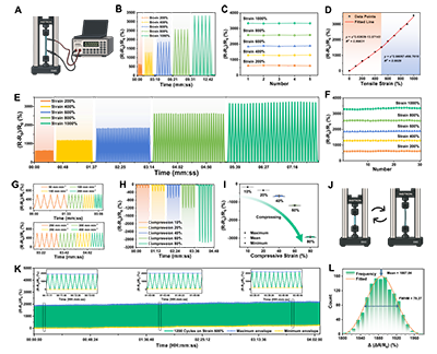 圖3 PCA改性淀粉/PAM水凝膠在拉伸、壓縮下的電學性能及循環(huán)穩(wěn)定性表現(xiàn)
