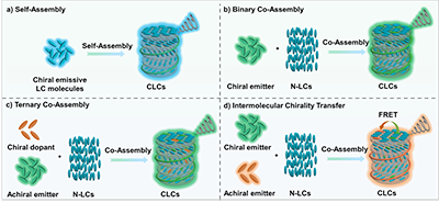 論文進一步梳理了構建具有CPL活性膽甾相液晶材料體系的三大核心設計策略。第一,液晶分子自組裝策略:通過共價鍵將發光基團與手性單元集成于單一液晶分子中,利用其自組裝能力直接構筑具有螺旋有序結構的發光液晶相。該策略所得材料結構均一、手性與發光功能高度協同,但分子合成通常較為復雜。第二,多組分共組裝策略:該策略具有高度靈活性,可分為兩類:(i)將兼具發光與手性功能的分子作為摻雜劑引入非手性液晶主體中,使其同時充當發光中心與手性源;(ii)將非手性發光分子、手性摻雜劑與非手性液晶主體三者共混組裝,實現手性源與發光中心的功能解耦。后者不僅簡化了分子合成,還便于獨立優化各組分性能,有利于多功能集成。第三,手性信號傳遞策略:借助CLCs基質的螺旋結構作為手性模板,或通過F?rster共振能量轉移(FRET)等過程,將手性信息高效傳遞至非手性發光客體,誘導其產生CPL。該策略有效拓展了發光材料的選擇范圍,并顯著提升了CPL性能。上述策略不僅顯著增強了發光不對稱因子(glum),還為構建對外部刺激(如光、熱、電場等)響應的動態CPL體系奠定了堅實的材料基礎。