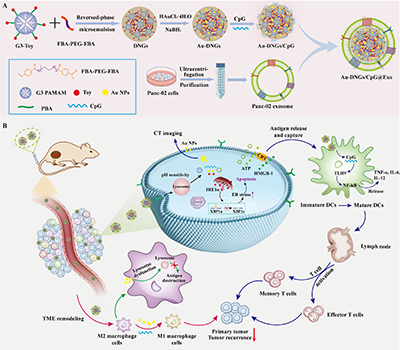 圖1.仿生Exo-DNG疫苗(Au-DNGs/CpG@Exo)的制備(A)及抗腫瘤機制(B)。