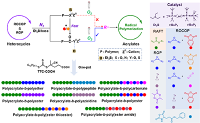 嵌段共聚物(BCPs)作為一類由化學(xué)性質(zhì)迥異的聚合物鏈段通過共價鍵精準連接而成的高分子材料,在納米技術(shù)、彈性體和光刻等領(lǐng)域展現(xiàn)出關(guān)鍵應(yīng)用價值。理論上,通過單體組合的多樣性可以實現(xiàn)BCPs結(jié)構(gòu)的無限可能;然而在實際層面,突破合成方法的限制,實現(xiàn)復(fù)雜嵌段結(jié)構(gòu)的高效構(gòu)筑,始終是高分子科學(xué)領(lǐng)域的重大挑戰(zhàn)。該領(lǐng)域的重要研究方向之一是聚焦于兩大聚合技術(shù)的有機融合:(1)乙烯基單體的可控自由基聚合(如RAFT聚合),優(yōu)異的官能團兼容性為分子設(shè)計提供了廣闊空間;(2)雜環(huán)單體的開環(huán)(共)聚合(RO(CO)P),可高效構(gòu)建含雜原子的功能化鏈段。雖然傳統(tǒng)方法通過金屬有機催化體系已實現(xiàn)聚酯-b-聚丙烯酸酯等特定嵌段共聚物的合成,但其局限性顯而易見——這類金屬有機催化劑通常僅適用于特定雜環(huán)單體的開環(huán)聚合反應(yīng),單體適用范圍有限,同時催化劑對自由基高度敏感。因此,發(fā)展單體普適性強、操作簡便的新型合成策略,實現(xiàn)結(jié)構(gòu)精準可控的多樣化嵌段共聚物高效制備,已成為推動高分子材料創(chuàng)新的關(guān)鍵突破口。