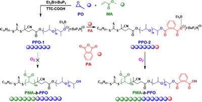 以環(huán)氧丙烷(PO)開環(huán)均聚反應(yīng)到丙烯酸甲酯(MA)RAFT聚合反應(yīng)的串聯(lián)為例,強親核性烷氧基活性物種與三乙基硼(Et3B)緊密結(jié)合,從而抑制其與氧氣反應(yīng)生成自由基。加入酸酐后,烷氧基物種可高效、定量轉(zhuǎn)化為親核性較弱的羧酸根物種,通入氧氣可有效啟動RAFT聚合反應(yīng),生成聚丙烯酸酯- b-聚醚兩嵌段共聚物PMA-b-PPO。