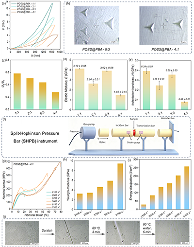 納米壓痕測試揭示了材料力學性能隨PBA含量的演變規律:隨著PBA含量增加,彈性模量從1.48 GPa提升至3.92 GPa,硬度高達0.36 GPa,接近聚酰亞胺甚至鋁合金水平。然而過高PBA含量因空間位阻導致交聯密度飽和,力學性能不升反降。分離式霍普金森壓桿測試進一步證實其卓越抗沖擊性:POSS@PBA-4:1在高速沖擊下仍保持結構完整,最大流動應力達695 MPa,沖擊韌性高達258.14 J cm-3。這一優異性能源于雙重協同機制——快速氫鍵瞬時耗能,慢速硼酸酯交換驅動結構恢復。此外,材料經多次再加工后力學性能幾乎無衰減,且在接近玻璃化轉變溫度時展現出劃痕自修復能力,為極端條件下的應用提供了可靠保障。