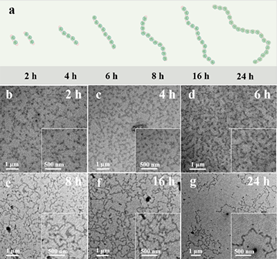 最引人注目的發現是,這些帶有補丁的納米粒子可在溶液中進一步“聚合”,形成類似高分子長鏈的超結構。這一過程被稱為“膠體聚合”,其動力學特征與傳統的逐步增長聚合高度相似。通過透射電鏡追蹤不同時間下的組裝進程,發現隨著組裝時間延長,線性鏈中的納米單元數目持續增加。通過對平均聚合度與時間的關系擬合,顯示出極高的反應效率。
