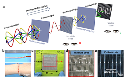 圖2. CLO纖維的可編織性及偏振光加密應用