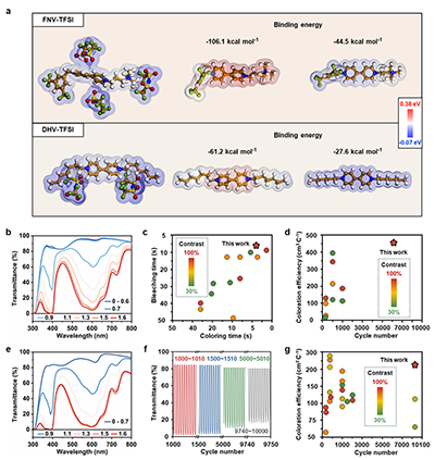 為使凝膠電解質(zhì)發(fā)揮最佳效能,研究團(tuán)隊(duì)還專門設(shè)計(jì)了一種新型不對(duì)稱紫精化合物(FNV-TFSI)。理論計(jì)算與實(shí)驗(yàn)結(jié)果表明,該不對(duì)稱分子結(jié)構(gòu)通過調(diào)控分子間相互作用,能夠有效抑制電致變色過程中紫精的二聚現(xiàn)象;同時(shí),端基季銨陽離子的引入還可以加速電荷轉(zhuǎn)移動(dòng)力學(xué),使器件的響應(yīng)速度得到明顯提升。本研究通過凝膠體系與電致變色活性分子的協(xié)同設(shè)計(jì),成功開發(fā)出一種兼具高安全性、高穩(wěn)定性與快速響應(yīng)特性的電致變色器件,為智能窗、防眩目后視鏡及軍事偽裝等應(yīng)用領(lǐng)域提供了新的技術(shù)路徑。