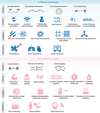 圖2. 纖維素基生物材料基本制備原理的分類與特征。(a) 物理交聯(lián)機(jī)制;(b) 化學(xué)交聯(lián)機(jī)制。
