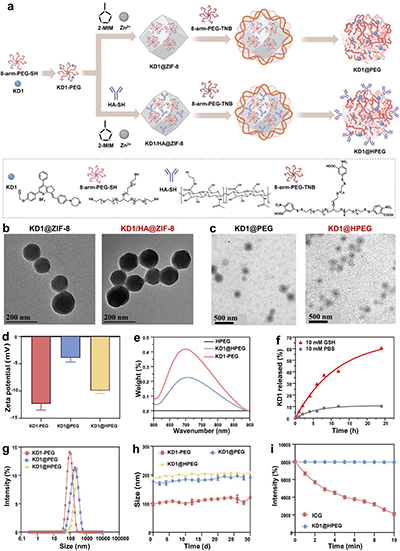 圖3. (a)利用ZIF-8模板制備KD1@PEG和KD1@HPEG納米顆粒的示意圖。KD1@PEG和KD1@HPEG 納米顆粒的(b)ZIF-8 圖像和(c)去除ZIF-8后的TEM圖像。(d)KD1-PEG、KD1@PEG和KD1@HPEG納米顆粒的Zeta電位和(e)紫外-可見吸收光譜。(f)10 mM GSH中KD1的釋放曲線。納米顆粒(g)在PBS中的粒徑分布曲線和(h)在PBS中30天內的尺寸分布。(i)在880 nm激光照射下KD1@HPEG和ICG 的熒光穩定性比較。
