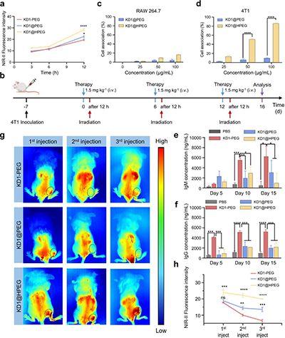 圖5. (a)納米顆粒注射后3、6 和12 h后荷瘤小鼠的NIR-II成像定量統計。(b)多次給藥的治療方案。(c)RAW264.7和(d)4T1細胞對KD1@PEG和KD1@HPEG納米顆粒的攝取。(注射KD1@PEG和KD1@HPEG納米顆粒后,小鼠體內(e)IgM和(f)IgG水平。(g)多次注射后的小鼠體內的(g)NIR-II熒光強度圖像和(h)定量統計。