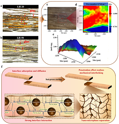 圖2 (a)LH-20和LH-50膠切面滲透情況光學(xué)顯微鏡圖像、膠黏劑滲透在木材內(nèi)部的(c)定位圖片、(d-e)FTIR顯微鏡圖像(記錄氨基甲酸酯鍵的特征吸收峰在FTIR圖像1742 cm?1處)、(f)LHWPU膠黏劑在粘結(jié)過程中的作用機制