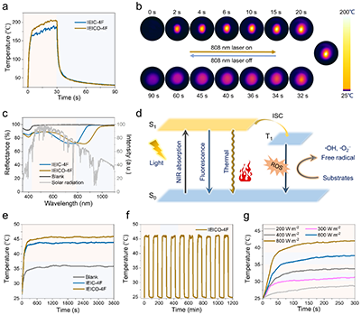 圖2 a, IEIC-4F和IEICO-4F粉末在808 nm激光照射下的光熱轉換行為;b, 通過熱像儀拍攝IEICO-4F粉末在808 nm激光照射下的紅外熱像圖,激光在30秒時關閉;c, IEIC-4F和IEICO-4F織物的反射光譜及太陽光譜圖。d, 光熱材料的工作原理圖。e, 通過熱電偶測量空白組、IEIC-4F和IEICO-4F織物(4×4 cm)在一個太陽光照下的光熱溫度。f, 通過熱電偶測量IEICO-4F織物在一個太陽光照下的光熱循環曲線。g, 通過熱電偶測量不同光照強度下照射時間與織物溫度的關系曲線。