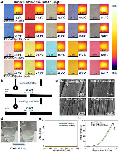 圖3 a, 不同顏色織物在標準太陽光照射下的情況,圖像由熱像儀拍攝,溫度值由熱電偶記錄;b, 棉織物上的水接觸角圖像;c, 空白棉織物和IEICO-4F@棉織物在20000倍和5000倍放大倍數下的掃描電鏡圖像;d, IEICO-4F@棉織物在洗滌劑中攪拌的照片。e, 攪拌前后洗滌劑的吸收光譜。f, 空白棉織物與IEICO-4F@棉織物的拉伸曲線。