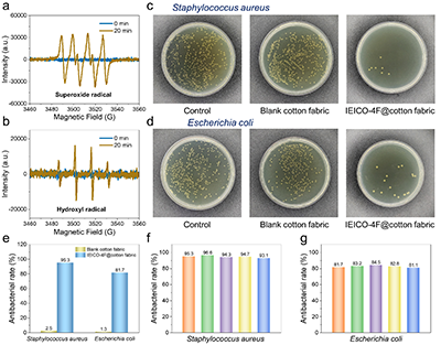 圖4 a, IEICO-4F@棉織物在黑暗條件下和光照20分鐘后,超氧自由基的電子順磁共振波譜;b, 羥基自由基的電子順磁共振波譜;c, 金黃色葡萄球菌和d, 大腸桿菌懸液通過涂布法在平板上于37°C培養后的菌落形成單位代表性圖像;e, 金黃色葡萄球菌和大腸桿菌的抗菌率;f, 同一IEICO-4F@棉織物對金黃色葡萄球菌和g, 大腸桿菌的循環抗菌性能。