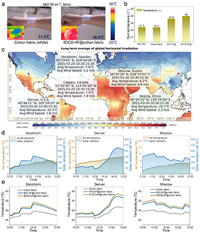 圖5 a, 在實際太陽輻射下的熱成像圖(天氣晴,東風2級,濕度53%,氣溫25℃,香港),圖像由熱像儀拍攝,溫度值由熱電偶記錄;b, IEICO-4F@棉織物在人體皮膚表面照射五分鐘后的溫度值。c, 全球太陽能資源分布圖。根據CC-BY知識共享署名4.0國際許可協議(https://creativecommons.org/licenses/by/4.0)改編。標注點代表五個測試地點:斯德哥爾摩(瑞典)、丹佛(美國)、莫斯科(俄羅斯)、北京(中國)、卡爾加里(加拿大),插圖展示了這五個測試地點的地形信息和氣象信息。d, 斯德哥爾摩、丹佛和莫斯科的詳細太陽輻照度與環境溫度數據。e, 在斯德哥爾摩、丹佛和莫斯科的日光照射下,覆蓋空白棉織物、IEIC-4F@棉織物和IEICO-4F@棉織物的模擬皮膚在5小時內的溫度變化。