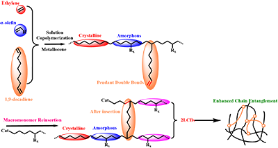 研究表明,在三元共聚過程中,1,9-癸二烯中雙鍵參與鏈增長反應(yīng),而另一端雙鍵則保留在聚合物側(cè)鏈上,形成帶有懸掛雙鍵的大單體。在后續(xù)聚合過程中,這些大單體可以再次插入活性中心并繼續(xù)增長,從而在主鏈上形成新的鏈增長位點,最終構(gòu)筑出長支鏈結(jié)構(gòu)。