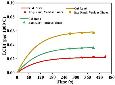 參數(shù)靈敏度分析表明,大單體再插入速率常數(shù) kb 對長支鏈含量影響最為顯著。當(dāng) kb 增加3倍時,長支鏈頻率最高提高約 180%;而當(dāng) kb 降低3倍時,則降低約 66%,表明大單體再插入過程在長支鏈形成中起主導(dǎo)作用。參數(shù)相關(guān)性分析進(jìn)一步發(fā)現(xiàn),二烯單體插入速率與大單體再插入速率之間存在一定耦合關(guān)系。在此基礎(chǔ)上,研究團(tuán)隊提出了簡化動力學(xué)模型,僅跟蹤二烯單體的一次插入和二次插入反應(yīng),從而在無需建立完整分子量分布模型的情況下預(yù)測長支鏈含量。結(jié)果表明,該模型對長支鏈含量的預(yù)測誤差僅為 3%–10%,在保持較高預(yù)測精度的同時顯著降低了模型復(fù)雜度,為聚烯烴反應(yīng)過程模擬及工業(yè)放大提供了理論基礎(chǔ)。