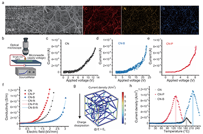 圖2 連續g-C3N4骨架的結構特征與非線性導電行為。結果表明,g-C3N4泡沫具有三維連通骨架結構;通過 B、P摻雜可有效調控材料的導電開啟行為,使復合材料在低填充條件下仍保持顯著的非線性導電特性。