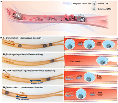不難看出,液態(tài)金屬細(xì)胞的問(wèn)世,提供了一個(gè)前所未有的獨(dú)立的可擴(kuò)展、多功能平臺(tái)。為說(shuō)明其應(yīng)用,文章展示了液態(tài)金屬細(xì)胞在變形通道中的幾類工作場(chǎng)景(圖5),發(fā)現(xiàn)通過(guò)集成導(dǎo)電性、磁響應(yīng)性和形態(tài)適應(yīng)性,可將有關(guān)功能單元發(fā)展成高靈敏性微型傳感器、智能流體閥門、高分辨成像單元以及高效材料運(yùn)輸載體甚至是腫瘤血管栓塞治療器件等,彰顯了液態(tài)金屬細(xì)胞在底層原理與技術(shù)上的基礎(chǔ)性和衍生性,預(yù)計(jì)可望在廣泛領(lǐng)域中大顯身手。