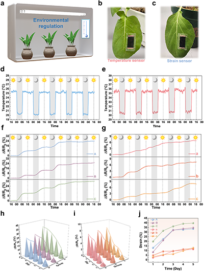 圖7.使用全封裝構型SPM/HMA@P電子皮膚對非生物脅迫下葉片表面溫度與生長的原位監測