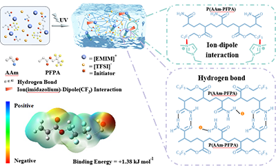 圖1 合成離子凝膠的一鍋制備法工藝,以及靜電勢能圖和對應的結合能。包含極性-CF3基團的柔性P(AAm-co-PFPA)共聚物網絡與[EMIM][TFSI]相互作用,形成物理交聯離子膠。