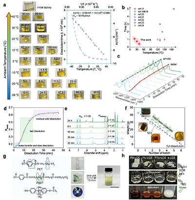 針對電力系統中廣泛使用的酸酐固化環氧樹脂,在本研究中,以1,5,7-三氮雜雙環 [4.4.0]癸烯-5-烯(TBD)為催化劑,熱固性環氧樹脂在30 °C的室溫下,在由甲醇和二氯甲烷組成的混合溶劑中,在最優條件下45分鐘內即可快速溶解。與同類型文獻報道結果相比,該方法在室溫下實現了相同甚至更快的降解速率(圖1b)。該方法也適用于其他含酯聚合物,為混合塑料廢棄物的一次性回收提供了簡易途徑。酯鍵廣泛存在于許多常用聚合物的分子結構中,包括聚酯纖維和工程塑料。在相同條件中,含酯鍵的商用塑料混合物可在15分鐘內完全溶解(圖1g)。該方法不僅適用于商用塑料,還可應用于前沿研究中開發的先進高分子材料,例如液晶彈性體(圖1h)。