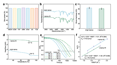 廢舊環氧完全溶解后,溶劑和催化劑易于除去和回收。高昂的催化劑可以以87%的回收率回收并利用于再次催化解聚環氧樹脂,效率幾乎不變。除去溶劑和催化劑之后的降解產物可類比工業上利用酯交換法制備PET的原理和設備再交聯得到原始環氧樹脂,幾乎無質量損失,且網絡性能和材料各項力學和熱學性能與原始環氧樹脂相當(圖4a-d)。此外,若環氧樹脂合成配方中的環氧低聚物自身含有羥基(例如e44),這些羥基在解聚-再交聯循環后得以保留,得到的再生環氧材料可以作為vitrimer使用(圖4e、4f)。