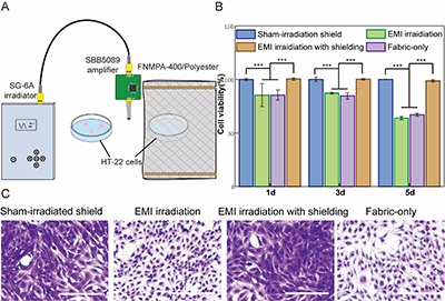 圖3. FNMPA-400/Polyester織物對電磁波的生物學(xué)抑制效應(yīng)。(A)神經(jīng)防護(hù)試驗裝置示意圖;(B)細(xì)胞活性;(C)HT-22細(xì)胞在5天試驗后的光學(xué)照片,比例尺為200μm。