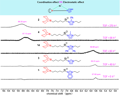 11B NMR化學位移的系統性變化為理解所觀察到的催化活性差異提供了直接的光譜依據(圖3)。11B NMR分析表明,催化劑活性與其硼中心的化學位移密切相關:活性最高的催化劑2(δ = 88.30 ppm)呈現顯著的低場位移,反映出咪唑鎓陽離子通過電子效應顯著降低了硼中心的電子密度。催化性能主要取決于取代基誘導的π共軛效應及由此引發的電子重新分布。其中,N-1位孤對電子參與芳香離域,削弱了氮原子的電子密度,并在雙功能催化體系中產生跨空間的電子傳遞效應。