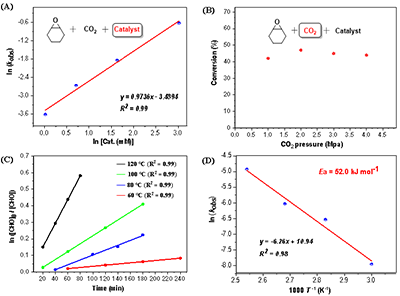 動力學研究表明:反應對催化劑濃度呈一級依賴;對二氧化碳壓力呈零級依賴,說明二氧化碳插入非速控步;對環氧化物濃度呈一級依賴;反應表觀活化能 (Ea = 52.0 kJ mol-1),與金屬催化劑相當(圖4)。