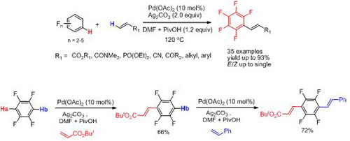 近年來過渡金屬催化的交叉偶聯反應作為一種高效、有力形成C-C鍵的手段已在不同領域受到廣泛應用,但是對于有機氟化學來說這一方法卻存在很大局限。其主要原因在于過渡金屬與高缺電子含氟基團,例如五氟苯之間形成的s鍵(M-C6F5)略帶離子鍵性質,其鍵能十分高,難于發生斷裂,從而導致催化循環很難進行(J. Am. Chem. Soc. 2009, 131, 7817)。這極大限制了利用過渡金屬催化的手段來促進有機氟化學的發展。此外,雖然目前對芳烴直接進行C-H活化烯烴化的反應已有大量報道,然而其大多局限于富電子芳烴,對于具有無導向基團缺電子芳烴的該類反應卻十分少見。因此,發展能夠在催化條件下實現高效簡捷直接與多氟芳烴鍵合形成C-C鍵的反應十分必要。