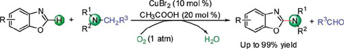 研究人員采用銅作為催化劑,分子氧為氧化劑,發(fā)展出了噁唑與三級(jí)胺直接氧化胺化的有效方法。該方法的催化體系簡(jiǎn)單高效,無需額外加堿,在常壓氧作為氧化劑的溫和條件下即可高選擇性的實(shí)現(xiàn)惰性鍵的活化與重組。該方法為利用三級(jí)胺作為氨基源發(fā)展高效的合成方法提供了新的途徑,為選擇性的C-H鍵和C-N鍵活化與重組提供了新的研究思路。研究結(jié)果發(fā)表在Org. Lett.(Org. Lett., Vol. 13, No. 3, 2011)。