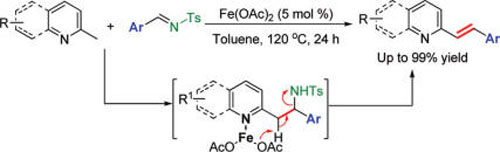 同時(shí),研究人員首次利用鐵作為催化劑,通過選擇性sp3C-H鍵活化及C-N鍵活化的方法,實(shí)現(xiàn)了2-取代吡啶或喹啉化合物與亞胺的反應(yīng),高區(qū)域選擇性的合成了反式2-取代的雜環(huán)烯烴類衍生物,此類化合物可作為具有生理活性的藥物前體。該合成方法簡(jiǎn)潔高效且環(huán)境友好,研究結(jié)果發(fā)表在Org. Lett.(Org. Lett., ASAP, DOI: 10.1021/ol200684b)。上述研究工作得到了國家自然科學(xué)基金和中國科學(xué)院百人計(jì)劃支持。