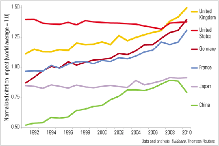 據10月28日出版的《科學》雜志報道,近日公布的兩份報告顯示,截至2010年,在論文最多產的6個國家中,英國論文的影響力(平均被引數)排名第一,其后依次是德國、美國、法國、日本和中國。