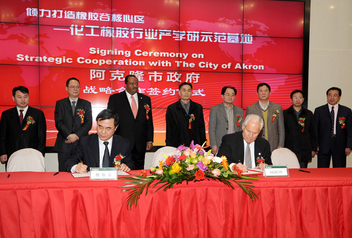 2011年1月7日,中國橡膠工業(yè)協(xié)會(huì)、青島市四方區(qū)人民政府、軟控股份有限公司與青島科技大學(xué)簽訂了在青島科技大學(xué)周邊合作暨共建化工橡膠行業(yè)產(chǎn)學(xué)研示范基地協(xié)議;2011年3月16日,化工橡膠行業(yè)產(chǎn)學(xué)研示范基地發(fā)展戰(zhàn)略說明會(huì)隆重舉行,“世界橡膠城”之稱的美國阿克隆市與青島市四方區(qū)當(dāng)天簽訂了友好城區(qū)戰(zhàn)略合作協(xié)議。