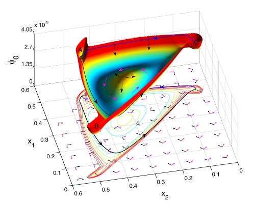 勢與流推動著進化。圖中曲面表示隱藏在進化背后的勢函數,其梯度(黑色箭頭)是主要來自于物理環境的進化驅動力,紫色箭頭描述另一種重要的進化驅動力—— 流,產生于生物環境。進化沿著勢函數減少的方向進行。圖中藍色“峽谷”區域對應著進化的一種最佳狀態,但是在“峽谷”中進化不會停止,峽谷中的“水流”推動著永無止境的進化。這就是著名的紅皇后假說中指出的:產生于生物間相互作用的“流”推動著永無止境的進化過程。物種的進化速度必須得趕上“峽谷”中“水流”的速度,否者會在生存競爭中被淘汰掉。