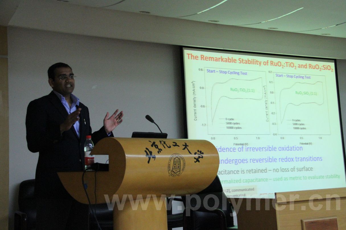 聚合物電解質燃料電池池(PEFCs)作為電化學發電設備廣泛應用于汽車、固定及便攜式電源、軍事等領域。在過去的20年內,相關技術雖然突飛猛進,但迫于組件壽命的限制,燃料電池堆仍然無法獨立運行。Vijay Ramani教授重點圍繞聚合物電解質燃料電池中的組件降解和減緩進行介紹。主要介紹了聚合物電解質燃料電池中催化劑的降解和減緩研究以及聚合物電解質燃料電池中離子滲透膜的降解和減緩研究。Vijay Ramani教授介紹了暫態模式下電化學催化劑載體的腐蝕和電解質膜的降解是限制電池堆壽命、增加成本的兩個主要原因。Vijay Ramani教授分析了上述兩個衰減過程(腐蝕及降解過程)如何影響電池壽命,并在此基礎上展示了伊利諾理工大學在提高燃料電池性能方面所進行的研究。Vijay Ramani教授深入淺出、清晰透徹、風趣幽默、形象生動的講座方式,吸引了在場全體師生,贏得陣陣掌聲。