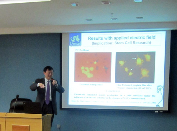 報告會開始,王文才教授對危巖教授進行了介紹。危巖教授目前擔任清華大學化學系講席教授及清華前沿高分子研究中心主任。他曾擔任爵碩 (Drexel)大學正教授(1995)和瓦格納化學講席教授(2004)。獲國家杰出青年基金(海外類)、中科院杰出海外學者基金及教育部長江講座教授稱號。目前為止已發表各類學術論文543篇(被引11000余次,H指數57)。入選中組部第二批“千人計劃”,于2009年11月全職加盟清華。2011年成為科技部973納米仿生能源專項首席科學家。報告中,危巖教授介紹了導電高分子在生物醫學、干細胞方面應用,無機二氧化硅介孔材料、自修復水凝膠等新型材料用于生物質制備乙醇以及樹枝狀高分子在藥物可控釋放等方面的研究進展。