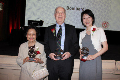 陳富美(左)、崔昕燕(右)與美國國家科學院院長Ralph J Cicerone(中)在卡內基科學獎頒獎禮上。