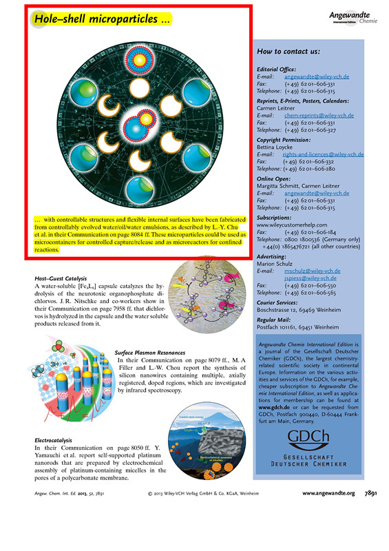 微納結構化是提升功能材料性能和拓展其新功能的重要途徑。在國務院發布的《國家中長期科學和技術發展規劃綱要(2006-2020年)》中,明確提出“新材料技術將向材料的結構功能復合化、功能材料智能化”等方面發展,并明確提出要重點研究材料的“人工結構化和小尺度化、多功能集成化等物理新機制、新效應和新材料設計”。 褚良銀教授課題組在國際上提出了一種用于可控制備具有特定形狀和功能的孔-核型微顆粒的新方法,利用微流控單分散雙重乳液為合成模板,創新性地通過可控調節該乳液體系的相界面特性,可控制備殼層上具有單個通孔結構的孔-殼型微顆粒。該微顆粒的內部空腔和殼層通孔的形狀和尺寸均可精確控制,且其空腔的表面性質也可靈活調控。該研究為設計和制備用于可控裝載/釋放、活性物質保護以及微反應等方面的新型微容器開辟了新途徑。日前,該研究成果“Hole-shell microparticles from controllably evolved double emulsions”發表在國際知名刊物《Angewandte Chemie International Edition》(I.F.=13.734)上(2013, 52(31): 8084-8087)。該研究工作因其新穎性和重要性而受到了高度重視,國際同行專家認為該論文中的新方法“巧妙”、“有趣”和“令人振奮”,被選為《Angewandte Chemie International Edition》雜志的封面論文(Cover Story)。