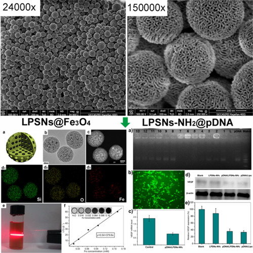 圖片說明: 具有大孔結(jié)構(gòu)的新型介孔材料的在不同放大倍數(shù)下的掃描電鏡照片(上圖),以及在功能性納米粒子(左下圖)和基因(右下圖)擔(dān)載方面的初步應(yīng)用。