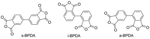 聚酰亞胺具有耐高溫、耐輻照、高熱穩定性和化學穩定性、不燃等卓越的物理化學性質,作為塑料、薄膜或纖維廣泛地用于航空航天、汽車、電子、原子能、特種織物等工業領域。不僅如此,聚酰亞胺材料有望在某些領域成為其他高性能聚合物的替代品。然而,制約聚酰亞胺材料應用的一個重要瓶頸是其高昂的價格,特別是聚酰亞胺材料在向民用領域發展時,這一瓶頸尤為突出。制備聚酰亞胺材料廣泛使用的一類二酐單體是如圖1所示的兩種聯苯二酐(s-BPDA,a-BPDA),其生產成本長期居高不下成為影響此類聚酰亞胺成本的重要因素,因此如何低成本制備聯苯二酐是相關基礎與應用研究密切關注的技術焦點之一。