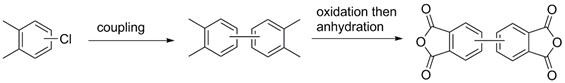 聯苯二酐合成的上游原料是氯代鄰二甲苯,包括3-氯代鄰二甲苯和4-氯代鄰二甲苯,由鄰二甲苯氯代制備,氯代過程得到的是兩種氯代鄰二甲苯的混合物,兩者的沸點相差3 °C,分離帶來大量的動力消耗,根據市場價格,單一氯代鄰二甲苯價格可達到混合氯代鄰二甲苯的五倍甚至更高。原有的聯苯二酐合成技術,依賴于氯代鄰二甲苯的氧化、酯化、偶聯等技術,偶聯過程產生大量的含鋅、鎳等的廢棄物。從原子經濟學角度考慮,建立高效、全新的合成方法是從根本上解決聯苯二酐高成本的唯一途徑。
