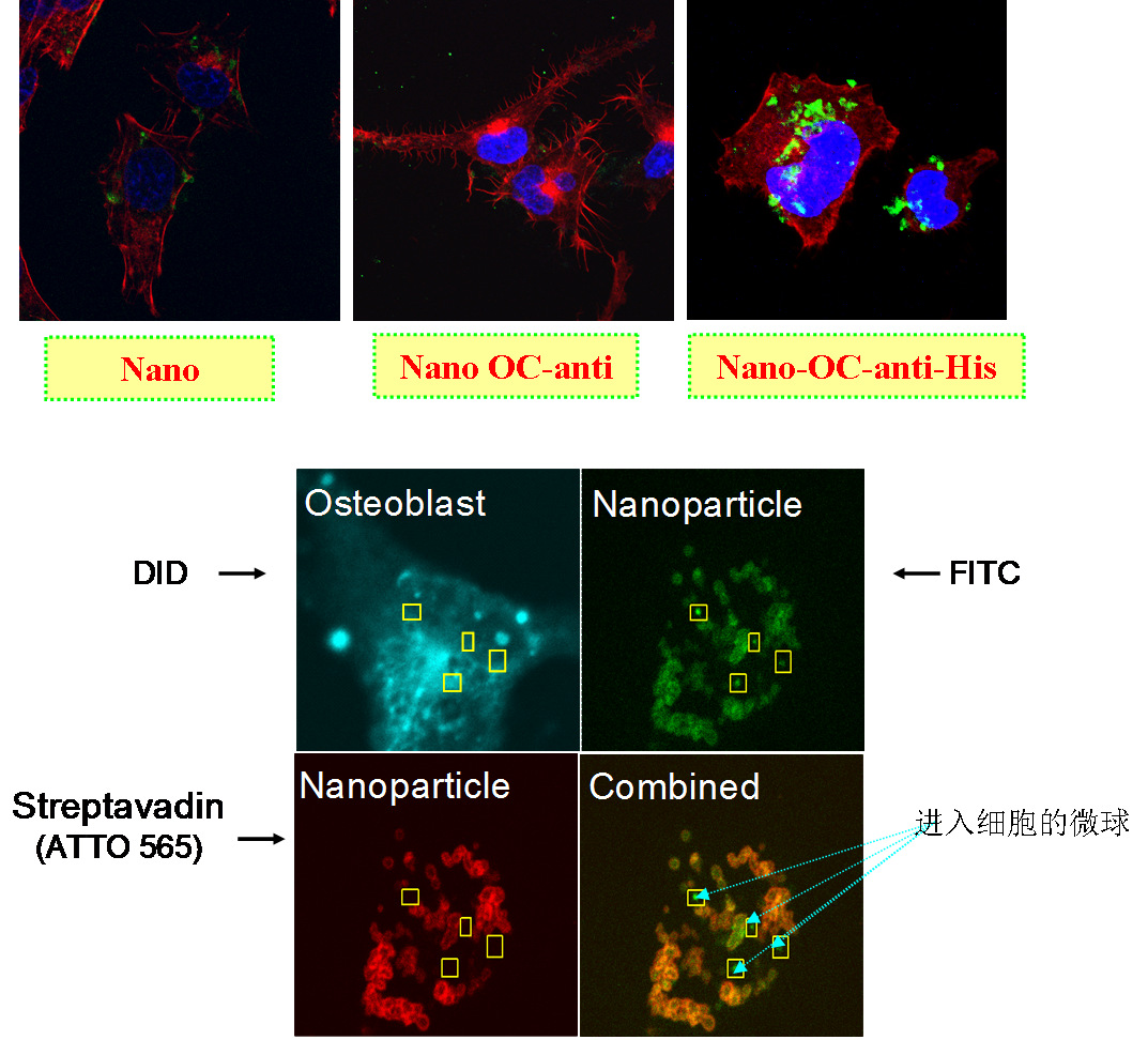 Fig.5 Association of surface-modified nanoparticles with osteoblast cells and their intracellular delivery into cell. The nanoparticles in square areas are immobilized into osteoblast cells. A double-stained method was used to indentify the intracellular location of nanoparticles.