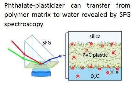 Upon water contact, phthalate-plasticized poly(vinyl chloride) (PVC) surfaces are highly unstable because the plasticizer molecules are not covalently bound to the polymer network. As a result, it is difficult to predict how the surface polymer chains and plasticizers may interact with water without directly probing the plastic/water interface in situ. We successfully studied the molecular surface restructuring of 10 wt% and 25 wt% bis 2-ethylhexyl phthalate (DEHP)-plasticized and pure PVC films (deposited on solid substrates) in situ due to water contact using sum frequency generation vibrational spectroscopy (SFG). SFG spectral signals from both the top and the bottom of the plastic film were obtained simultaneously, so a thin-film model spectral analysis was applied to separately identify the molecular changes of plastics at the surface and the plastic/substrate interface in water. It was found that in water both the structures of the plastic surface and the buried plastic/substrate interface changed. After removing the samples from the water and exposing them to air again, the surface structures did not completely recover. Further SFG experiments confirmed that small amounts of DEHP were transferred into the water. The leached DEHP molecules could reorder and permanently transfer to new surfaces through water contact. Our studies indicate that small amounts of phthalates can transfer from surface to surface through water contact in an overall scope of minutes. This study yields vital new information on the molecular surface structures of DEHP plasticized PVC in water, and the transfer behaviors and environmental fate of plasticizers in polymers.