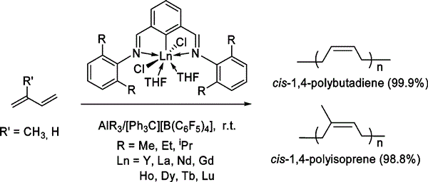關鍵字:aryldiimine NCN-pincer ligated,homogeneous Ziegler-Natta catalyst system, excellent cis-1,4 selectivities, Ln-Al bimetallic cations