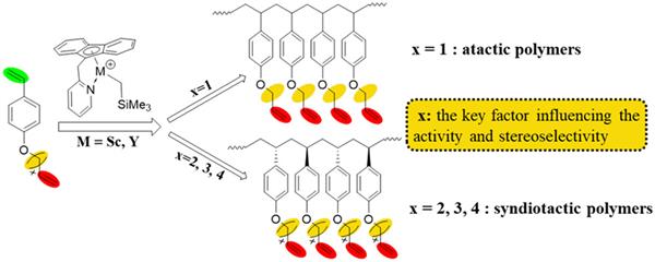 Chemoselective polymerization of divinyl monomers is a promising strategy to access functional polymers via postpolymerization, which however, encounters a cross-linking problem. Herein, we report the coordination polymerization of polar divinyl styrenyl monomers 1-(allyloxy)-4-vinylbenzene (AOS), 1-(but-3-en-1-yloxy)-4-vinylbenzene (BOS), 1-(pent-4-en-1-yloxy)-4-vinylbenzene (POS), and 1-(hex-5-en-1-yloxy)-4-vinylbenzene (HOS) by employing the thiophene-fused cyclopentadienyl scandium bis(alkyl) complexes (2,5-Me2-3-Ph-6H cyclopenta[b]thiophenyl)Sc(CH2SiMe3)2THF (1) and (2,4,5,6-Me4-4H cyclopenta[b]thiophenyl)Sc(CH2SiMe3)2THF (2) and the pyridinyl methylene fluorenyl rare-earth metal complexes (Py-CH2-Flu)Sc(CH2SiMe3)2 (3) and (Py-CH2-Flu)Y(CH2SiMe3)2THF (4). Complexes 1 and 2 show high chemoselectivity for these polar divinyl styrenyl monomers across the styrenyl C═C bond but give atactic products. Catalysts 3 and 4 exhibit solitary chemoselectivity to give atactic poly(AOS) but syndiotactic poly(BOS), poly(POS), and poly(HOS). The copolymerization of the polar divinyl styrenyl monomers with ethylene (E) mediated by 3 exhibits chemoselectivity to afford POS/E and HOS/E copolymers but homopolymer poly(AOS). The reasons behind the (co)polymerization behaviors were investigated by DFT calculation.