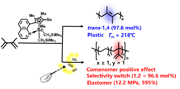 2,3-Dimethylbutadiene (DMB), a very old monomer used for making rubber albeit with poor elastomeric property a century ago, is rather di?cult to polymerize due to its steric bulkiness. Herein, we report the successful coordination-insertion homopolyme rization of DMB in trans-1,4 selectivity using the designed quinolinyl-functionalized cyclopentadienyl and thiophene- fused cyclopentadienyl scandium complexes to give a plastic product. Based on this, the copolymerization of DMB and ethylene (E) was realized with high activity through the comonomer “positive e?ect”. More interestingly, high 1,2-regioselectivity of DMB was achieved (96.6 mol %) in copolymerization. Density functional theory (DFT) calculation revealed that the regioselectivity switch is triggered by the comonomer E, which coordinates to the active metal center to cause the isomerization of the active species from the Sc-η3 -allyl mode to the Sc-σ-alkyl mode. The resultant E/DMB copolymers bear the pseudo-random sequence distribution to exhibit high elongation and strength (595%, 12.2 MPa) contrary to the crystalline properties of PDMB and PE precursors, indicating a rubbery material. This work paves an avenue to make high-performance materials from the commonly used or even abandoned monomers.