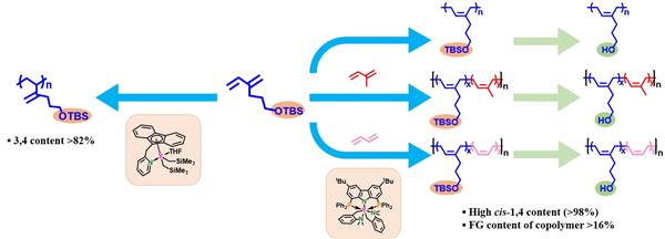 用于催化硅烷基保護的極性共軛雙烯單體IP-OTBS 均聚合,制得了順式1,4-結構單元含量最高為98.5% 和3,4-結構含量最高達82.2% 的聚(IP-OTBS). PNP-型稀土釔催化劑2 催化IP-OTBS 與1,3-丁二烯(BD)、異戊二烯(IP)無規共聚合,制備出了極性基團含量分別為10.2% 和16.7% 的順丁橡膠和異戊橡膠. 這些極性聚合物在四丁基氟化銨的作用下脫除硅烷基保護基團,制得醇羥基功能化的順丁橡膠和異戊橡膠.